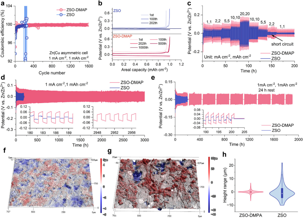 图5. ZSO-DMAP电解液中Zn负极的电化学性能。a)Zn|Cu非对称电池在1mAcm−2、1mAhcm−2下的库仑效率和b)不同循环的相应电压曲线。c)不同电流密度和面积容量下Zn|Zn对称电池的倍率性能。d)Zn|Zn对称电池在1mAcm−2、1mAhcm−2下的长期循环稳定性。e)使用不同电解液对Zn|Zn对称电池进行循环和搁置的间歇测试。f)ZSO-DMAP和g)ZSO中循环100小时的Zn负极的CLSM图,以及h)相应的表面粗糙度分布。