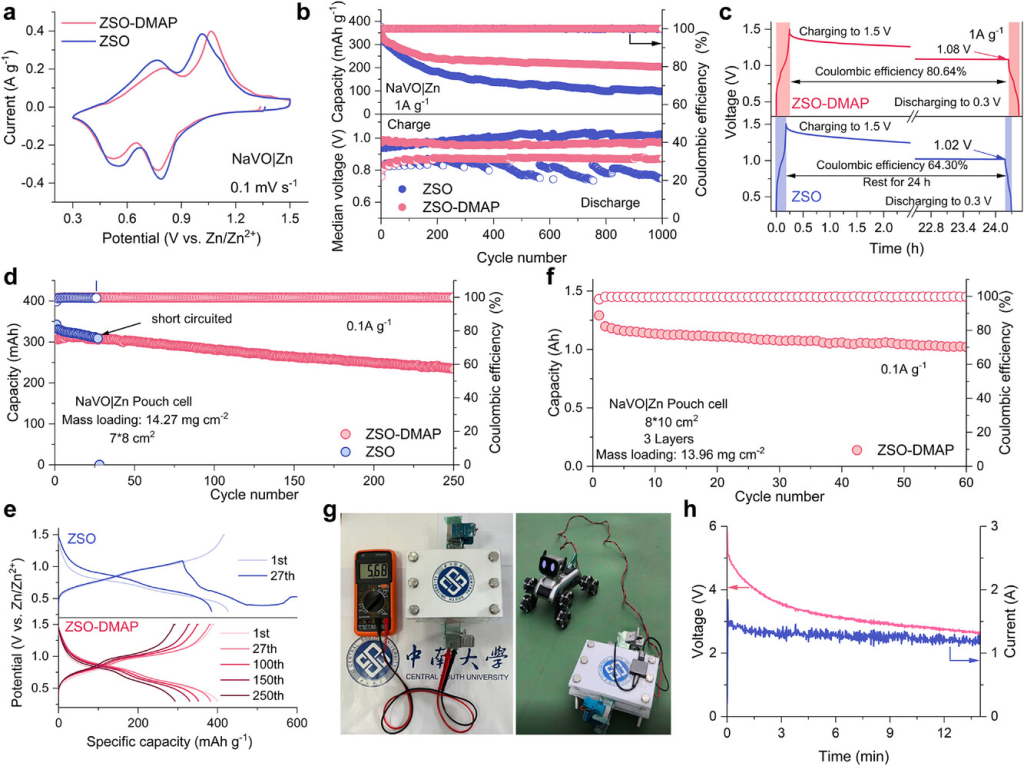 图6. NaVO|Zn全电池的电化学性能及实际演示。a)不同电解液的NaVO|Zn全电池循环伏安曲线。b)NaVO|Zn全电池在1Ag−1下的长期循环性能。c)NaVO|Zn全电池的自放电测试曲线。d)0.3Ah软包电池的循环稳定性和e)不同循环对应的电压曲线。f)采用ZSO-DMAP电解液的1.2Ah级软包电池的循环稳定性。g)软包电池和机器狗的数字图。h)机器狗操作过程中软包电池的电压和电流曲线.