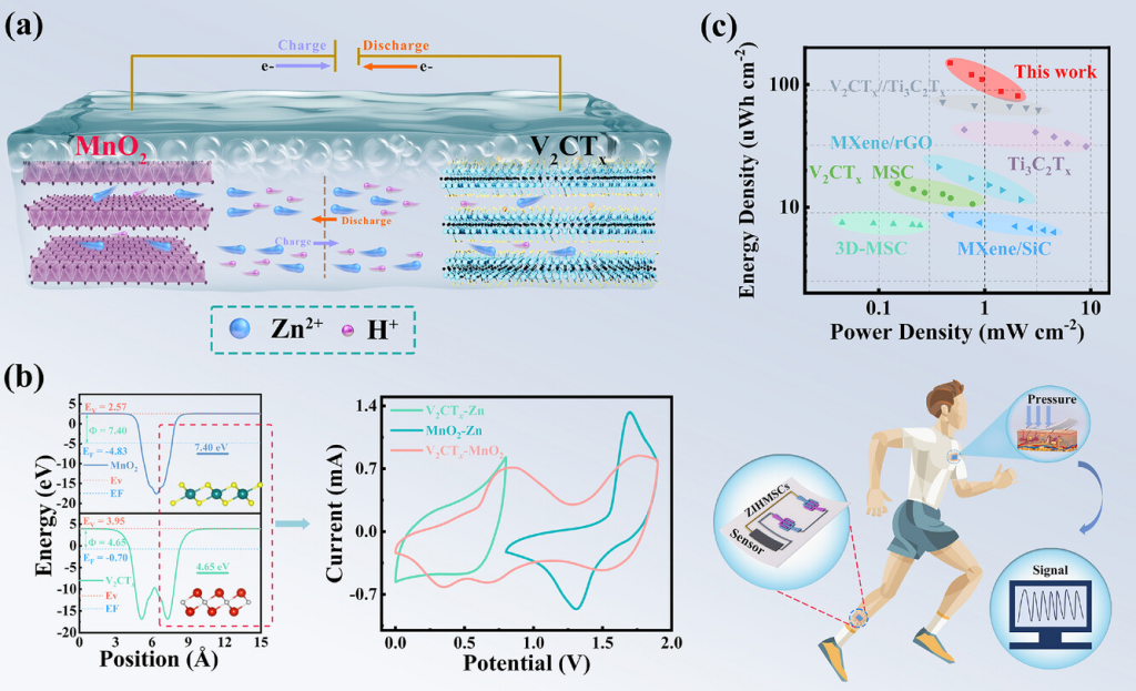 便携式电子设备需求的不断增长显著推动了储能领域的发展。近年来,水系锌离子混合微型超级电容器(ZIHMSC)因其卓越的功率密度、更高的安全性和更低的成本而成为研究的焦点。这项工作介绍了一种柔性ZIHMSC,其正极为MnO2,负极为V2CTx。V2CTx和MnO2电极之间的最佳电荷平衡和功函数差异,在470µWcm−2的功率密度下显著提高了150µWhcm−2的能量密度,并实现了1.9V的宽电压窗口。此外,该器件还展示了306mFcm−2的面积电容。通过密度泛函理论(DFT)计算和各种原位和非原位表征测试方法分析了工作机理。基于V2CTx//MnO2的ZIHMSC可以集成到传感系统中,并有效检测各种人体活动,凸显了其在可穿戴电子技术中的应用价值。这项工作为开发下一代高能量密度的锌离子混合设备提供了一种创新方法。