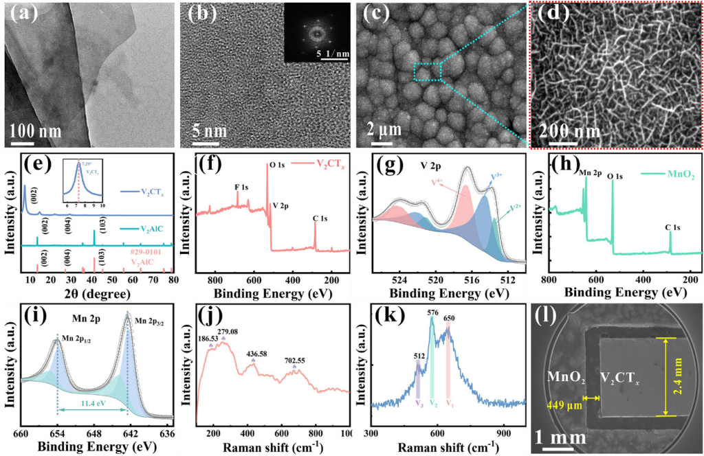 图2.V2CTx和MnO2的结构和成分表征。a)V2CTx的TEM图和b)HRTEM图,插图显示FFT斑点。c、d)不同放大倍数下的MnO2SEM图。e)V2AlC、V2CTx的XRD。f)V2CTx的XPS和g)V2CTx的V2p。h)MnO2的XPS和i)MnO2的Mn2p。j)V2CTx和k)MnO2的拉曼,l)集成ZIHMSC的SEM图。