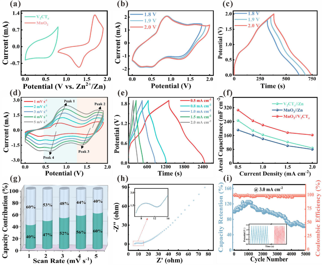 图3. 基于V2CTx//MnO2的ZIHMSC的电化学性能。a)V2CTx//Zn和MnO2//Zn的CV曲线。b)ZIHMSC在0–1.8、0–1.9和0–2.0V范围内的CV曲线和(c)GCD曲线。d)1-5mVs−1时的CV曲线。e)0.5–2.0mAcm−2时的GCD曲线。f)MnO2//Zn、V2CTx//Zn和V2CTx//MnO2的面积电容。g)容量贡献百分比。h)阻抗谱。i)ZIHMSC的循环寿命和库仑效率,插图显示了前十个循环和后十个循环。