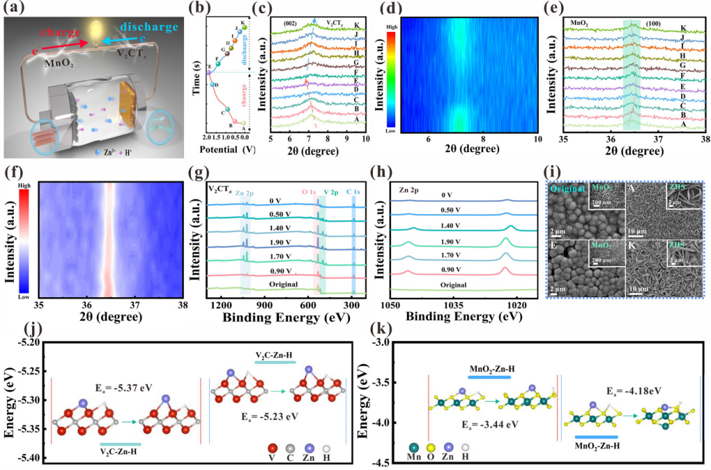 图4. V2CTx//MnO2器件的储能机理。a)ZIHMSC示意图。b)基于V2CTx//MnO2的ZIHMSC的GCD曲线。c)V2CTx阳极充放电过程中的原位XRD光谱和d)相应的等高线图。e)MnO2阳极充放电过程中的原位XRD光谱和f)相应的等高线图。g)V2CTx阳极充放电过程中的原位整体XPS光谱和h)充放电过程中Zn2p的原位XPS光谱。i)完全充放电后MnO2的原位SEM。j)V2CTx在Zn2+和H+上的吸附能和电荷密度。k)MnO2在Zn2+和H+上的吸附能和电荷密度。