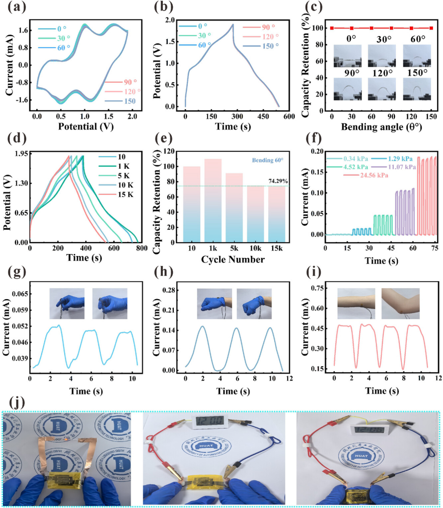 图5.基于V2CTx//MnO2的ZIHMSC集成应用系统。a)CV曲线和b)弯曲角度为0-150°时的GCD曲线。c)不同弯曲角度后的容量保持率。d)弯曲程度不同的60°角时的GCD曲线。e)弯曲60°不同时间后的容量保持率。f)ZIHMSC驱动的压力传感器在不同压力值下的I-t曲线。ZIHMSC供电的压力传感器用于检测g)人体手指h)手腕和i)弯曲站下的手臂活动。j)ZIHMSC驱动的LED灯和时钟的光学照片