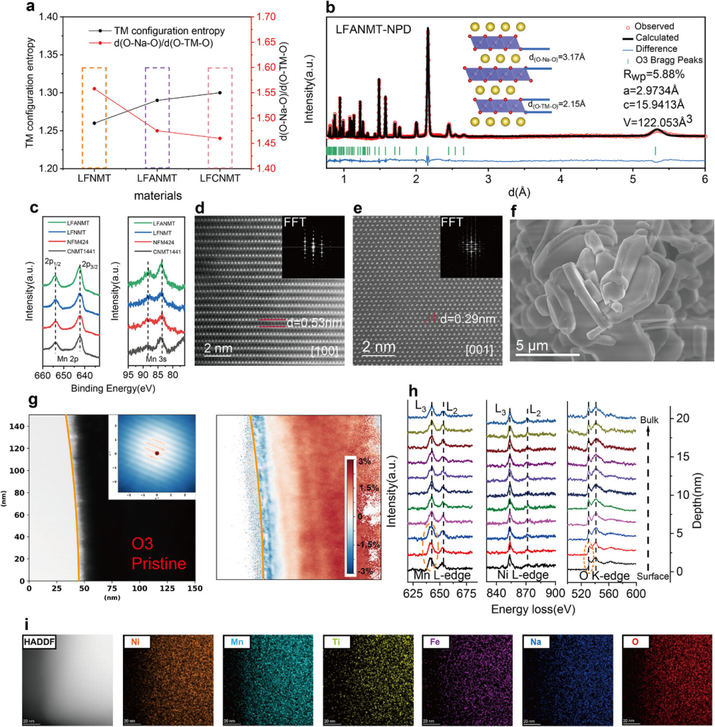 图1. LFANMT的结构和形貌表征。a)阴极的TM组态熵和d(O-Na-O)/d(O-TM-O)。b)LFANMT的NPD细化模式和结构示意图。c)四个阴极的C1s、Mn2p、Mn3s和Ni2p的XPS剖面。d,e)[100]和[001]区域投影中的像差校正透射电子显微镜(AC-STEM)图像。f)LFANMT的SEM图像。g)在STEM-NBD模式下获得的O3相的应变图像。h)从表面到本体记录了MnL边、NiL边和OK边的EELS光谱。i)元素的STEM图像和EDS映射。