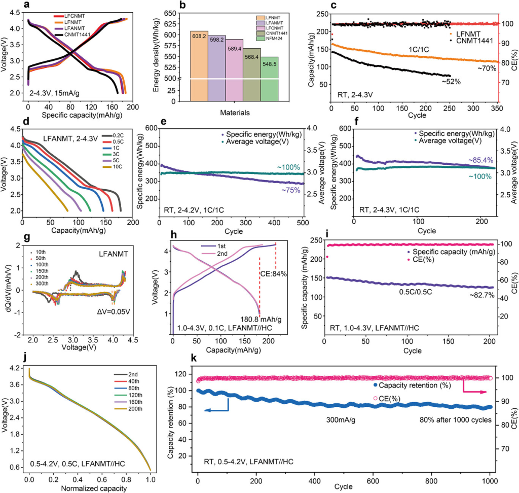 图2.采用多元组成调制策略设计的正极的电化学性能。a)电压范围为2-4.3V时15mAg−1的充电和放电曲线。b)能量密度(基于正极材料)。c)LFNMT在1C/1C下的循环性能,在15mAg−1下进行两个初始化成循环后(未显示)。d)LFANMT在0.2至10C下的倍率性能。e,f)LFANMT在1C/1C下的循环性能和平均放电电压,在15mAg−1下进行三个初始化成循环后(未显示)。g)LFANMT300次循环的dQ/dV曲线。h)0.1C下未回收HC阳极的前两个全电池曲线。i)LFANMT//HC(4.3V,0.5C)的全电池循环性能。j)经过三次化成循环后,0.5C电流密度下HC阳极全电池中LFANMT的归一化电压-容量曲线。k)LFANMT//HC(4.2V,2C)的全电池循环性能。