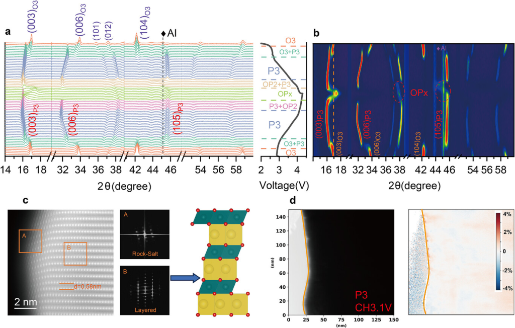 图3. LFANMT在第一个循环中的晶体结构演变。a)0.1C时2–4.3V电压范围内的电压曲线和相应的原位XRD。b)结构演变过程中原位XRD的2D轮廓图。c)电荷状态为3.1V的LFANMT在[100]区域投影的STEM图像,以及两个区域的FFT图。d)在STEM-NBD模式下获得的P3相(CH3.1V)的应变图。