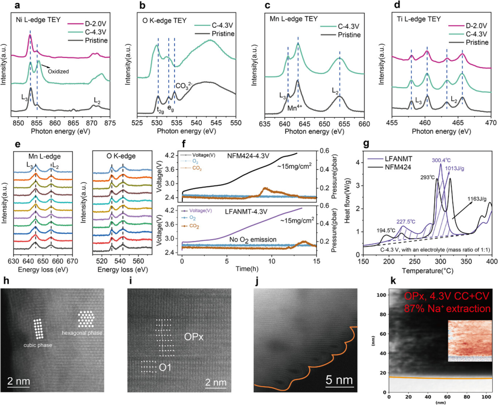 图4.LFANMT的4.3V充电状态和离子氧化还原分析。a–d)TEY模式下NiL边、OK边、MnL边和TiL边的软XAS光谱。e)从表面到本体(0-10nm)记录的EELS光谱(CH4.3V)。f)第一个循环充电过程中的原位DEMS剖面。g)NFM424和LFANMT正极的DSC剖面,以5°Cmin−1的升温速率充电至4.3V。h–j)充电状态(0.04C、CH4.3V、CC+CV)的STEM图像。k)通过4D-STEM获得的OPx相的应变图。