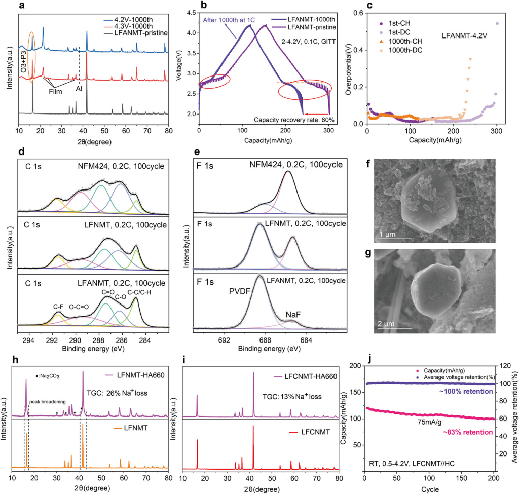 图5.采用多元成分调制策略设计的正极空气稳定性测量与失效分析结果。a)LFANMT在1C下循环1000次后的XRD。b)LFANMT在1C下循环1000次后的GITT曲线。c)LFANMT循环1000次后的过电位。d,e)LFANMT循环100次后C1s和F1s处的XPS剖面图。f)LFANMT在1C下电压范围为2–4.2V下循环500次后的SEM图。g)LFANMT在1C下电压范围为2–4.3V下循环200次后的SEM图。h,i)LFNMT和LFCNMT在连续气体(CO2浓度≈600ppm,RH=60%)中暴露48小时后的XRD和TGC结果。j)LFCNMT//HC在0.5C时0.5至4.2V之间的全电池循环性能。