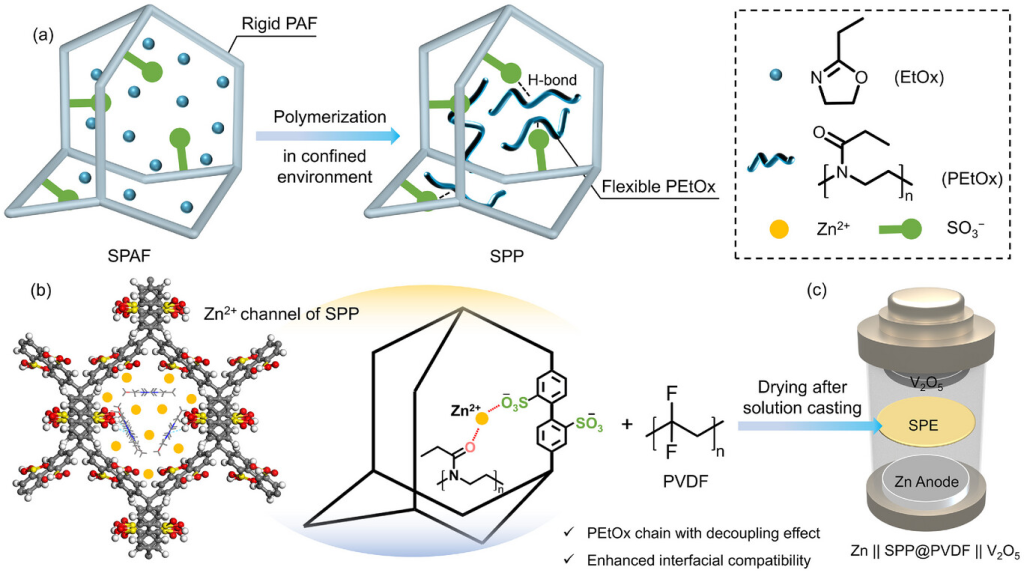 图1.SPE的设计理念和Zn2+离子传输机理。a)SPAF作为引发剂引发EtOx的CROP,在多孔骨架中发生聚合反应,得到在密闭环境下生长的PEtOx链的示意图;b)本工作中提出的Zn2+离子传输机理,PEtOx的溶剂化作用促使Zn2+离子与−SO3−基团脱偶联;c)基于SPP@PVDFSPE的Zn||V2O5全电池透视图,SPP@PVDFSPE是通过将SPP与PVDF基质混合制备而成。