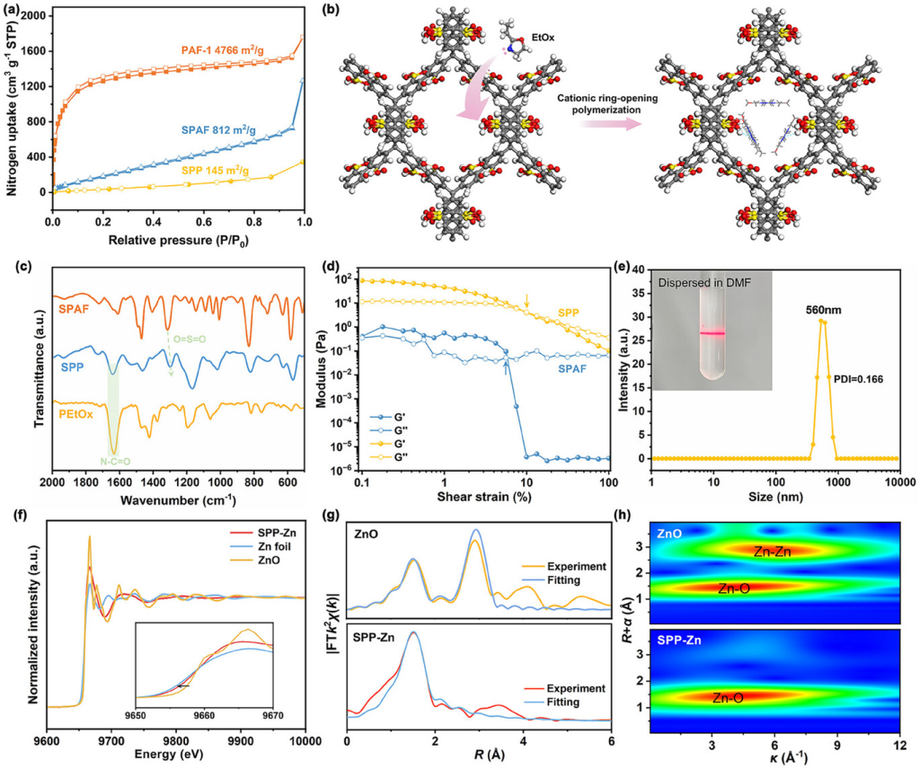 图2.SPAF和SPP的制备和结构表征。a)PAF-1、SPAF和SPP在77K下的N2吸附和解吸等温线;b)SPAF作为引发剂引发EtOx开环聚合的示意图;c)SPP、SPAF和PEtOx的FT-IR光谱;d)SPP和SPAF在DMF中的悬浮液的应变相关模量图。箭头表示屈服点;e)SPP的粒度分布,插图显示了SPP的DMF分散体表现出的廷德尔现象;f)Zn箔、ZnO和SPP-Zn的归一化XANES光谱;g)EXAFS光谱在R空间中的k2加权傅里叶变换以及相应的SPP-Zn和ZnO拟合曲线;h)EXAFS光谱的小波变换图。