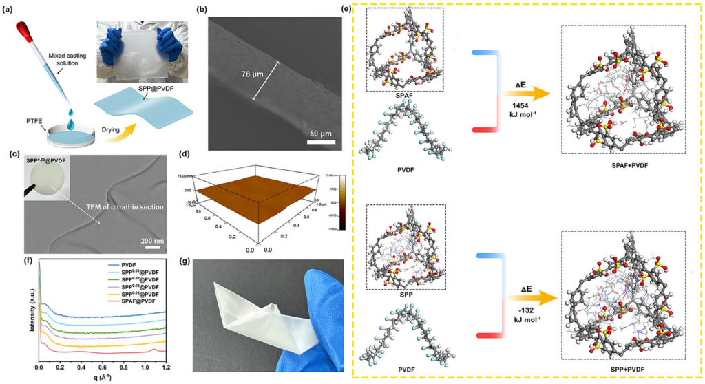 图3.SPP@PVDFSPE膜的制备与表征。a)溶液浇铸法制备SPE膜示意图,可获得大尺寸膜;b)SPP0.02@PVDF膜横截面的SEM图;c)SPP0.02@PVDF膜的光学图(插图)及其对应的超薄切片TEM图;d)e)分散在PVDF基质中的SPAF和SPP的色散能理论计算示意图;f)SPPx@PVDF、SPAF0.02@PVDF和PVDF膜的SAXS剖面图;g)将SPP@PVDF膜折叠成小船的形状。