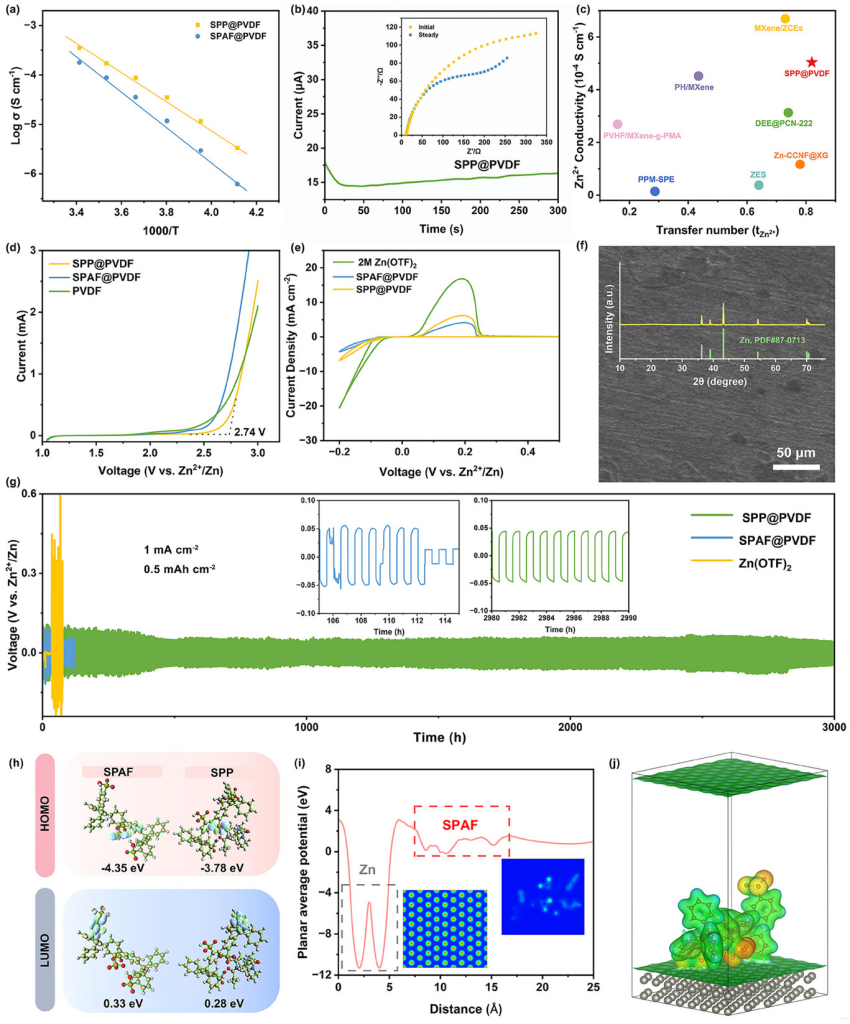 图4.SPP@PVDF制备锌负极的Zn2+离子稳定性/可逆性和传输性能/机理。a)不同温度下SPP@PVDF和SPAF@PVDF的Zn2+离子电导率;b)室温下SPP@PVDF(0.82)的tZn2+,插图为极化前后的EIS;c)SPP@PVDF的tZn2+和Zn2+离子电导率与之前基于SPE报道的工作的比较;d)SPP@PVDF、SPAF@PVDF和PVDF的LSV曲线;e)SPP@PVDF镀锌/脱锌的CV曲线;f)基于SPP@PVDF的锌对称电池经过100次循环后锌箔表面的SEM图和XRD(图中黄色曲线),绿色曲线为锌的PDF卡片;g)使用不同电解质的Zn对称电池在1mAcm−2和0.5mAhcm−2下的循环性能(插图显示相应的放大电压曲线);h)计算的SPP和SPAF的前线分子轨道能量;i)从Zn(002)晶体表面到SPAF界面的平面平均电势;j)吸附在Zn(002)晶体表面的SPAF碎片的电荷密度三维分布的45°侧视图。