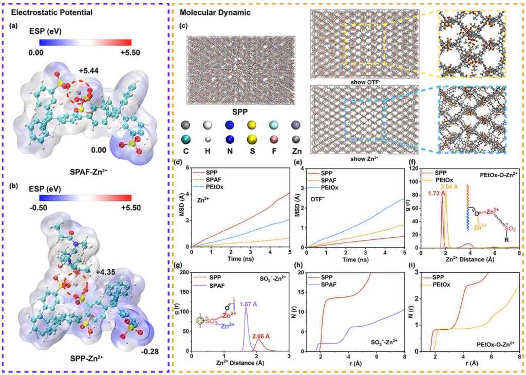 图5.Zn2+离子传输机理的理论计算。图a)和b)中SPAF和SPP中Zn2+离子类溶剂鞘层结构的ESP分布;图c)SPP晶胞的MD模拟图像,右侧为SPP晶胞中隐藏的PEtOx链,分别显示SPAF、OTf−和Zn2+离子的放大细节;图d)和e)中Zn2+离子和OTf−离子的MSD随模拟时间的变化;图f)Zn2+离子与SPP和纯PEtOx电解液(O−Zn2+)的RDF计算结果;图g)Zn2+离子与SPP和SPAF(SO−−Zn2+)的RDF计算结果;图h)SPP和SPAF电解液中SO−−−Zn2+的CN以及SPP和PEtOx中Zn2+离子与羰基氧的CN随时间的变化的MD模拟结果。