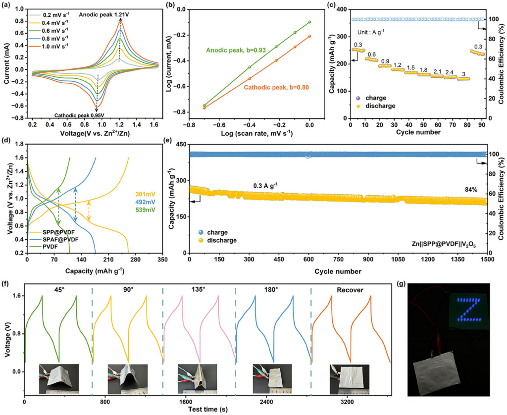 图6.Zn||SPP@PVDF||V2O5ZSSB的电化学性能。a)不同扫描速率下Zn||V2O5全电池的CV曲线;b)还原和氧化峰电流与扫描速率平方根的线性拟合;c)基于SPP@PVDFSPE的Zn||V2O5全电池的倍率性能;d)基于SPP@PVDF、SPAF@PVDF和SPP@PVDF的ZSSB在0.3Ag−1下的恒流充放电(GCD)曲线;e)基于SPP@PVDFSPE的Zn||V2O5全电池在0.3Ag−1下的循环性能和库仑效率;f)基于SPP@PVDF电解质的Zn||V2O5袋电池在不同弯曲角度下的循环性能;g)为LED平板供电的组装袋电池(内部串联)的光学照片。