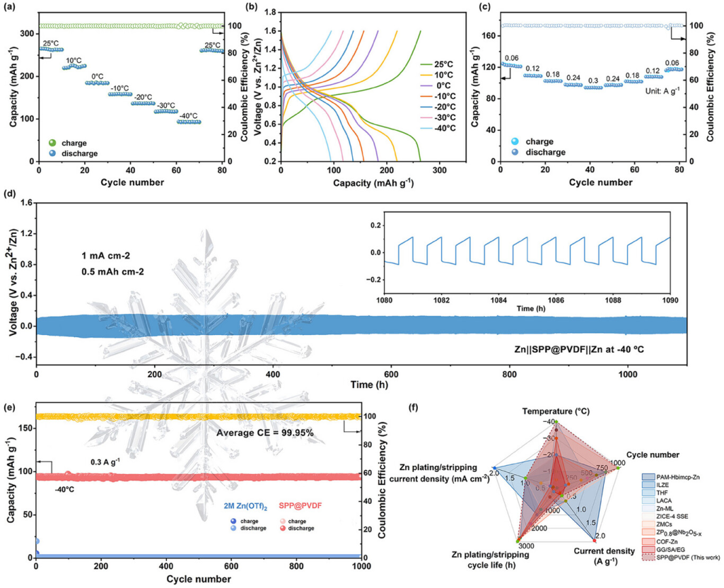 图7.Zn||SPP@PVDF||V2O5ZSSB的低温电池性能。a)不同温度下的充电和放电容量和b)GCD曲线;c)−40°C时的倍率性能;d)−40°C下Zn对称电池的循环性能;e)−40°C下0.3Ag−1时的循环性能和库仑效率;f)当前材料与近年来报道的低温ZIB材料性能的比较。