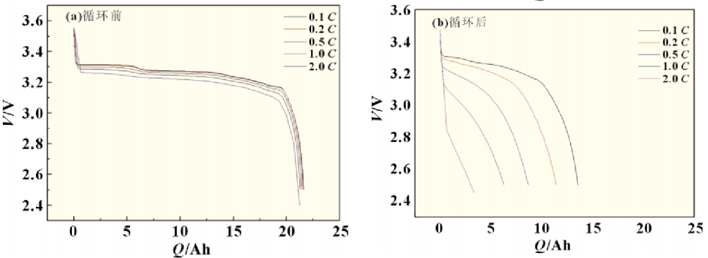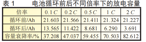 从表1中可以看到0.1C下循环前容量21.603Ah,循环后容量降低为13.565Ah,衰降37.2%,2C下循环前容量为21.227Ah,循环后容量降低为3.691Ah,衰降82.6%,同时极化也出现了明显的增加,随着放电电流的增加,放电电压快速衰降。