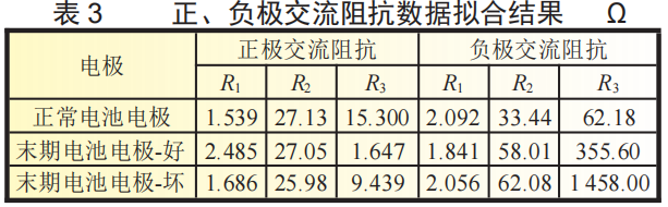 从图7(b)中负极的交流阻抗数据可以看到,负极的交流阻抗测试结果主要由两个半圆构成,其中第一个半圆为负极表面SEI膜的扩散阻抗,而第二半圆则为负极表面的电荷交换阻抗,从表3的拟合结果来看,负极的SEI膜阻抗在循环后出现了明显的增加,寿命末期负极状态较好的位置SEI膜阻抗增加73%,而状态较差的位置SEI阻抗增加85.6%,变化最大的是负极的电荷交换阻抗,在循环之前负极的电荷交换阻抗为62.18Ω,寿命末期的负极状态较好的位置电荷交换阻抗增加472%,达到了355.6Ω,而在电极状态较差的位置增加幅度更是达到了2244.8%,达到1458Ω。