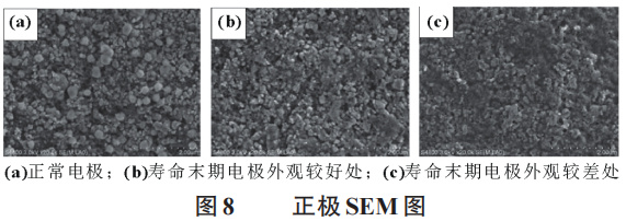 为了分析正负极的衰降原因,通过扫描电镜(SEM)分析了寿命末期电池正负极形貌的变化,从图8(a)可以看到在循环前LFP电极表面整洁,没有明显的电解液分解产物,但是在经过寿命测试后,即便是在电极表面状态较好的区域[图8(b)]也出现了明显的电解液分解产物,覆盖了部分电极。而在电极表面外观较差的区域[图8(c)],则能够观察到大量的电解液分解产物,覆盖了大部分电极的表面。