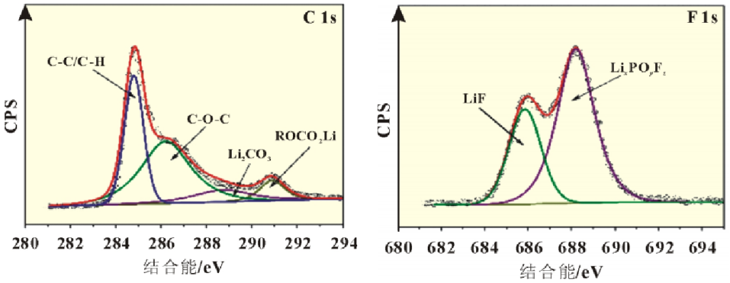 为了分析正极表面电解液分解产物,采用X射线光电子能谱(XPS)对正极表面成分进行了分析,从图9 (C 1s) 中可以看到主要特征峰来自 C-C (284.5 eV)、C-H (285.6 eV)、C-O-C(286.5 eV)、Li2CO3(289.6 eV)、ROCO2Li(290.5 eV),主要来自溶剂分子的分解,在图9 (F1s) 中主要有两个峰,分别位于688.4和684.8eV附近,对应的为LixPOyFz和LiF,主要来自LiPF6的分解。