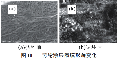 图10所示为电池隔膜的形貌,从图中可以看到在经过循环后隔膜内的孔隙被完全填充,完全看不到隔膜上的孔隙,表明循环过程中大量的电解液分解产物造成了隔膜空隙堵塞,影响了Li+扩散,导致电池阻抗增加。