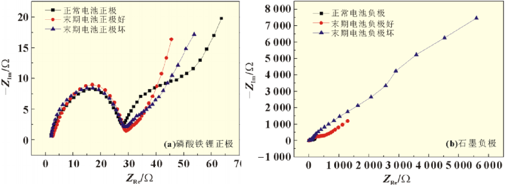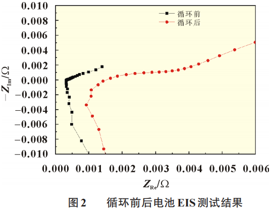 在全电池性能测试中,观察到电池直流阻抗从1.033mΩ增加到了18.33mΩ,增加将近18倍,严重影响了电池的大电流放电能力。为了分析造成电池内阻增加的原因,采用电化学工作站对电极的交流阻抗数据进行了测量。
