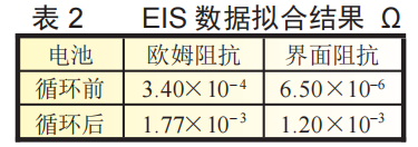 图2所示为循环前后电池的交流阻抗测试结果,从图中可以看到循环后电池的阻抗明显增加。采用Zview软件对测试数据进行拟合,拟合结果如表2所示,从表2中能够看到电池在循环后欧姆阻抗增加了6倍左右,界面膜阻抗和电荷交换阻抗增加了将近200倍,这表明电池在循环后由于电解液大量在电极表面分解造成了电池界面阻抗、电荷交换阻抗的增加。同时分解产物堵塞了电极孔隙,导致电池欧姆阻抗也出现了显著的上升。