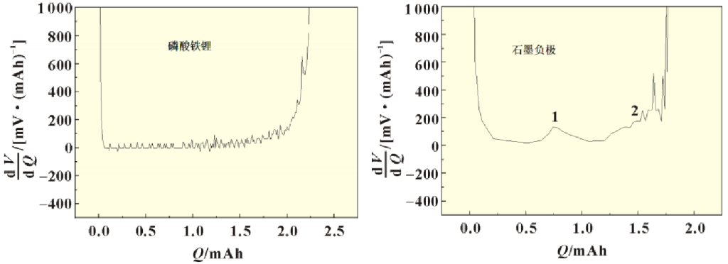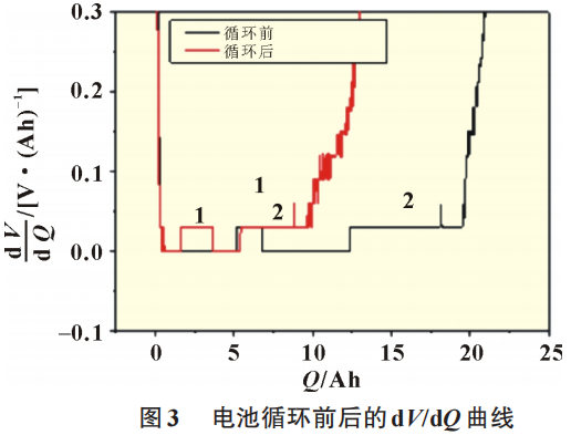 图3所示为电池循环前后的dV/dQ曲线,从图中可以看到曲线中有两个特征峰1和2,根据图4中正极和负极的dV/dQ曲线可以判断这两个特征峰主要是反应负极的相变。