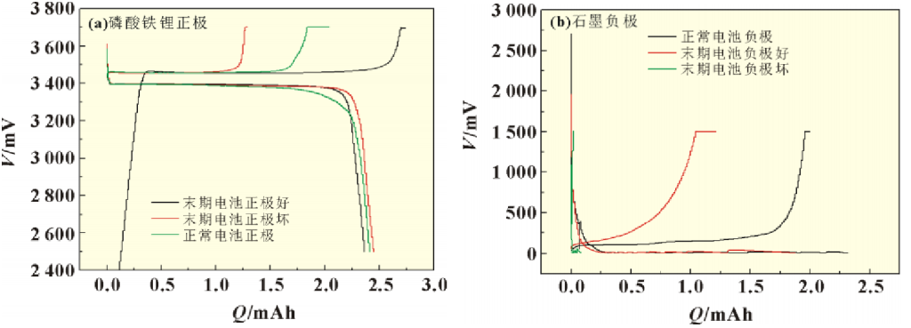 为了对上述结论进行验证,采用解剖后的电极制备了扣式电池,分析正负极活性物质的损失。图5(a)中为LFP正极的扣式电池数据,由于电极中的含Li量不同,因此三者的充电容量也有一定的差距,但三者的放电曲线基本一致,没有明显的变化,表明循环后LFP正极基本上没有发生明显的活性物质损失。