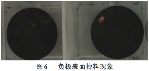 图5(b)为石墨负极在循环前后的扣式电池充放电曲线,从图中可以看到在循环前直径为18mm的负极容量为2mAh左右,但是在经过循环后负极状态较好的极片边缘位置的容量仅为1.21mAh,而状态较差的中间位置容量仅为0.02mAh,几乎无法完成放电,因此不难看出负极在经过循环后存在严重的活性物质损失现象,特别是极片中间位置几乎没有容量,结合负极中间位置电极存在较为严重的掉料现象(如图6所示),因此基本可以判断负极活性物质损失主要来自于负极与集流体之间的剥离,负极活性物质不与集流体之间接触,无法参与反应,导致活性物质的损失,这与前面的dV/dQ曲线的分析结果相一致。
