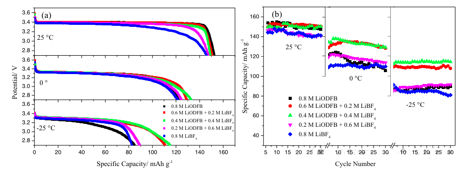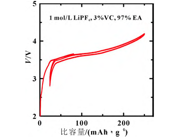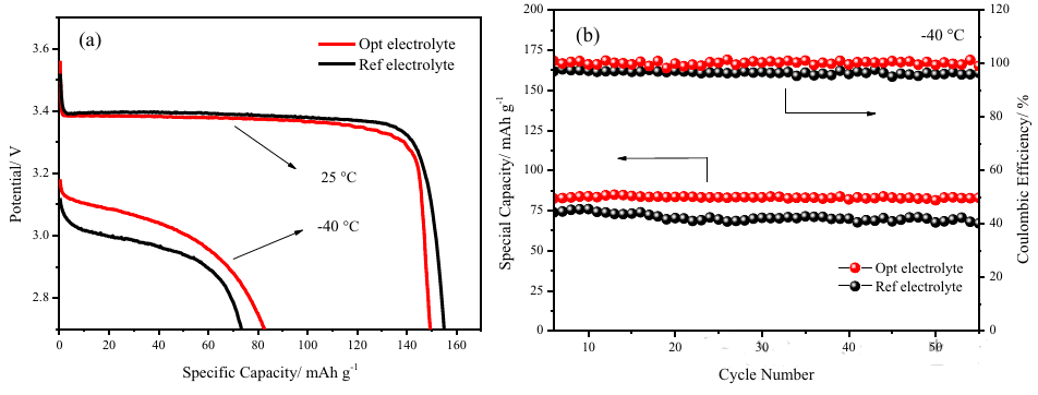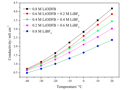 Zhao 等研究了LIBF4 /LiODFB(摩尔比1∶1)-EC/ DMC/亚硫酸二甲酯(DMS)(体积比1∶2∶1)的电解液 体系,在-40℃下的放电比容量为82.5mAh/g,并且在50次循环后具有约100%的容量保持率。