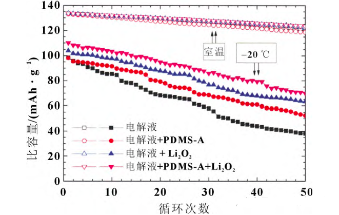 Won 等使用PDMS-A和锂改性二氧化硅纳米盐(Li2O2 ) 作为LIBs的电解液添加剂,利用其电化学稳定性提高LIBs电池在-20℃下的性能,总体 而言,与 没 有 添加剂的LIBs(95mAh/g)相比,具有这 种双添加剂配方的LIBs在-20℃和0.1C放电倍率 下具有高的比容量(110mAh/g)。