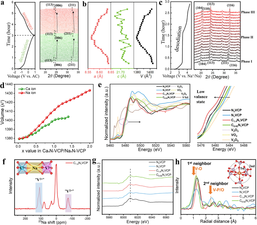 图2. a)CaxNaV1.5Cr0.5(PO4)3的充放电电压曲线和原位XRD图。b)由(a)得到的CaxNaV1.5Cr0.5(PO4)3的晶格参数演变。c)N3VCP形成N1VCP的充电电压曲线和原位XRD图。d)CaxN1VCP和NaxNa1VCP的体积变化与阳离子浓度的关系比较。e)VK边XANES,f)固态23NaNMR光谱,g)CrK边XANES,h)不同充电/放电状态下CaxNaV1.5Cr0.5(PO4)3的EXAFS光谱。