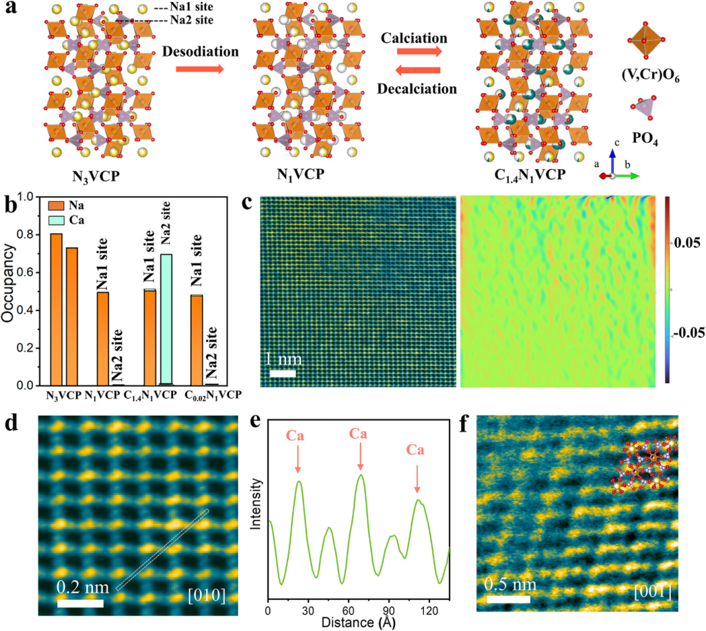 图3. a)CaxNaV1.5Cr0.5(PO4)3在钙化和脱钙反应中的晶体学演变示意图。b)不同充电/放电状态下CaxNaV1.5Cr0.5(PO4)3中Na1和Na2位点的阳离子占据情况。c)C1.4N1VCP的iDPC-STEM图像和应变映射图。d)C1.4N1VCP的iDPC-STEM图和e)强度分布。f)C0.02N1VCP的iDPC-STEM图。