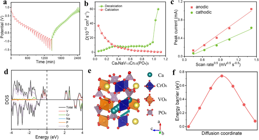 图4. a)CaxNaV1.5Cr0.5(PO4)3的GITT曲线和b)钙化和脱钙过程中相应计算的Ca2+离子扩散系数。c)从CV曲线得出的阳极和阴极峰值电流与扫描速率平方根的线性拟合。d)计算的N1VCP的DOS和相应的部分DOS图。e)Ca离子扩散路径和f)N1VCP中的能垒。