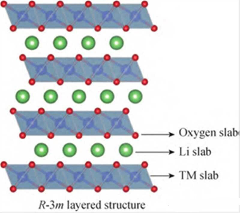 它的结构是由6个氧原子与一个过渡金属原子(M=Ni,Co,Mn,Al等)形成MO6八面体,Li+占据3a位点,M离子占据3b位点,O2-占据6c位点(图1)。目前高镍材料面临的主要问题是界面问题导致其循环性能较差,高比容量优势无法发挥。
