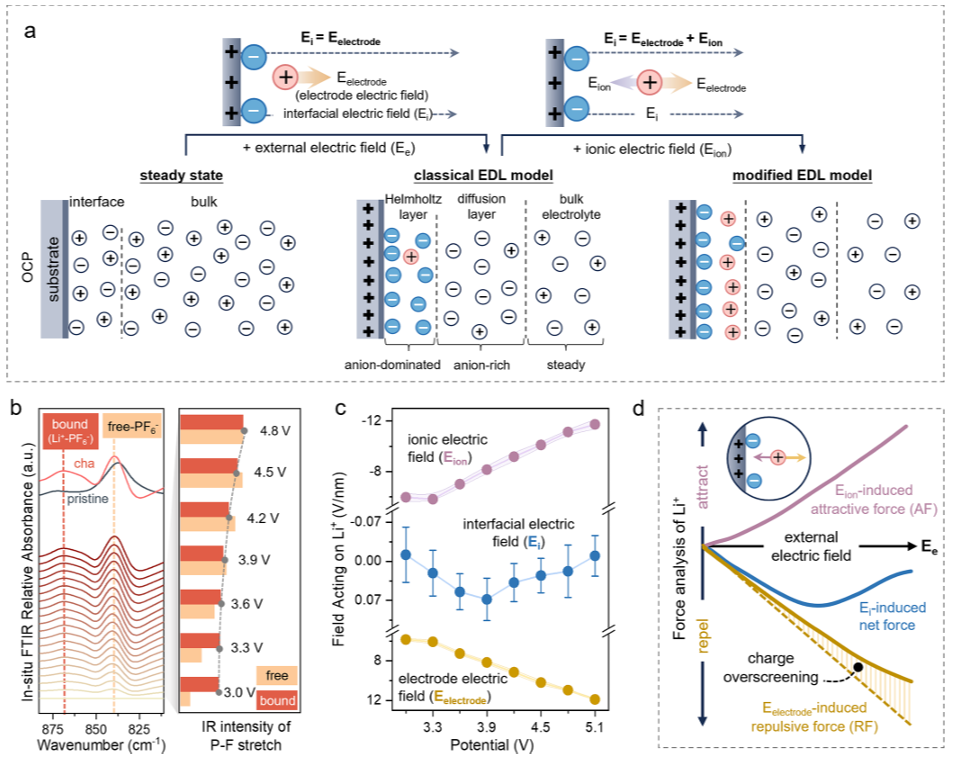 图1.界面电场和作用于界面Li+的净力的动态演变。(a)二维平面界面上的EDL模型图。左图展示了OCP下的EDL,代表了稳态电解质结构。中间和右图描绘了存在外部电场(Ee)时的EDL:(中间)经典模型;(右)引入离子电场(Eion)的改进模型。在经典模型中,界面电场(Ei)主要由电极(Eelectrode)产生的电场组成。引入Eion后,Ei为Eelectrode和Eion的矢量和。注意:金属电极与电解质之间的接触通常会导致OCP偏离零电荷点,从而导致界面电荷分布不均匀和界面电场(Ei)较弱。为简单起见,此处忽略OCP下的Ei,假设界面和本体电解质之间的物质分布相同。(b)线性扫描伏安法(LSV)期间P-F振动区域内Al表面的原位FTIR差异光谱(扣除OCP背景),表明随着施加电位的增加,界面处游离和配位PF6-的浓度均显著增加。深灰色线是原始电解质的红外吸光度。(c)模拟界面Li+所经受的电场强度与施加电位(3.05至5.1V)的关系。为了公平比较,统计区域限制在距电极表面0.8-1.8nm的范围内,因为在较高电位下,0-0.8nm区域内不存在Li+离子。(d)作用于界面Li+的力与电位关系的示意图。