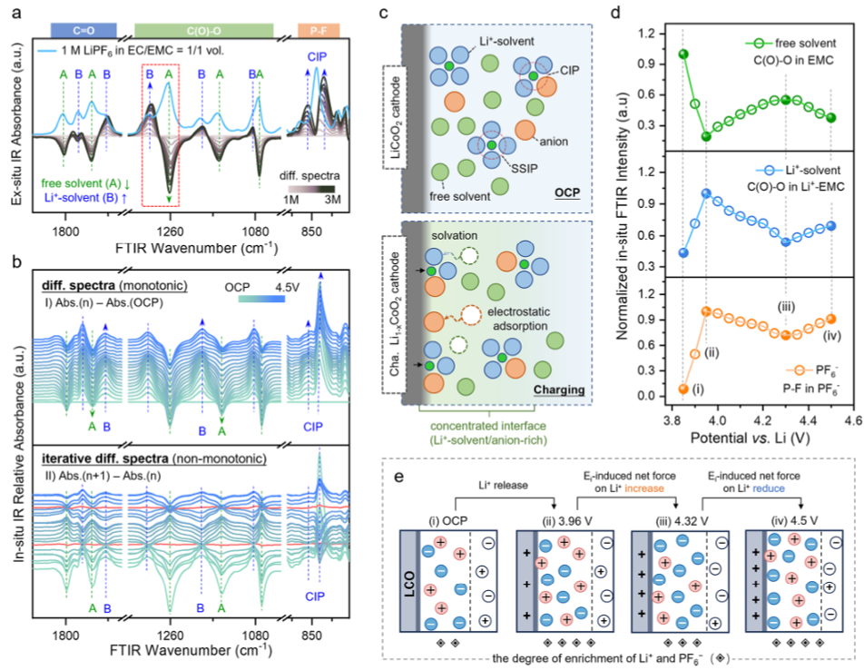 图2.LiCoO2正极表面界面电解质的多阶段演变。(a)不同浓度(1-3M)电解质的原位FTIR差异光谱,以1M光谱为背景。蓝线是1M电解质的FTIR吸收光谱。(b)(顶部)Li||LCO电池首次充电过程中LCO表面的原位FTIR差异光谱,其中OCP光谱作为背景减去。(底部)通过减去相邻光谱获得迭代差异光谱。(c)充电和OCP条件下界面的示意图比较。在充电过程中,Li+从正极释放并与吸附的溶剂分子配位,而阴离子静电吸附到LCO表面,从而形成浓缩界面。(d)Li||LCO电池中LCO表面电解质物质特征振动模式的电位相关红外吸收。(e)不同带电状态下界面离子分布示意图。白色菱形符号内含黑色小菱形,表示离子富集程度——符号越多,界面浓度越高。