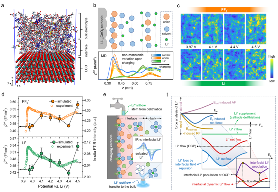图3.充电正极动态界面演化模型的构建。(a)模拟系统中LCO-电解质界面的快照。(b)不同充电电位下界面电解质物质的数密度分布,以及相应的EDL示意图。虚线标记Li+(绿色)、PF6–(橙色)和EC/EMC(蓝色)密度分布中的峰值位置,颜色越深表示施加的电位越高。(c)模拟的不同电位下界面离子分布的示意图。(d)Li+和PF6–(实心圆)的电位相关累积数密度与原位FTIR吸收强度(空心圆)的关系。尽管转折点存在微小偏差(∼0.1V),但实验和模拟结果呈现出一致的宏观趋势:界面离子表现出多阶段的“富集-耗尽-再富集”过程。(e)界面Li+粒子数动力学的“储层模型”类比:正极脱锂(Li+流入)和电场驱动的Li+跨界面相迁移(Li+流出)共同决定了界面Li+粒子数。溶剂化Li+的原位FTIR吸收强度直接反映了界面Li+的这种变化。(f)决定界面Li+粒子数的界面“场-流”竞争模型示意图。界面电场通过静电排斥决定Li+的损失,而正极脱锂引起的Li+流动决定Li+的供应。这两个因素都通过控制界面处的动态Li+流动来决定实时Li+粒子数。