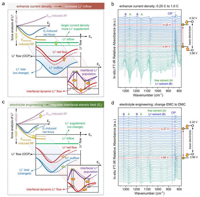 图4.电流密度和溶剂调节对界面Li+布居的影响。(a)示意模型分析和(b)原位FTIR展示了电流密度升高对界面Li+布居动力学的影响。较高的电流密度(1C)会增加Li+的流入并引起净流量向上移动。与基线(0.2C)相比,升高的电流会压缩拐点之间的电位窗口。(c)示意模型分析和(d)原位FTIR实验结果显示了不同介电常数溶剂的影响。用介电常数较低的溶剂DMC代替EMC,该溶剂为离子提供的静电屏蔽较弱,增强了阳离子和阴离子之间的相互作用。在低电位下,可解离的离子对较少,导致吸附的阴离子较少,对Li+的排斥力较强,导致第一个拐点电位提前移动。同时,在高电位下,离子间相互作用增强,增加了吸附阴离子对Li+的吸引力,降低了Li+所受的净力,导致第二个拐点电位提前发生偏移。