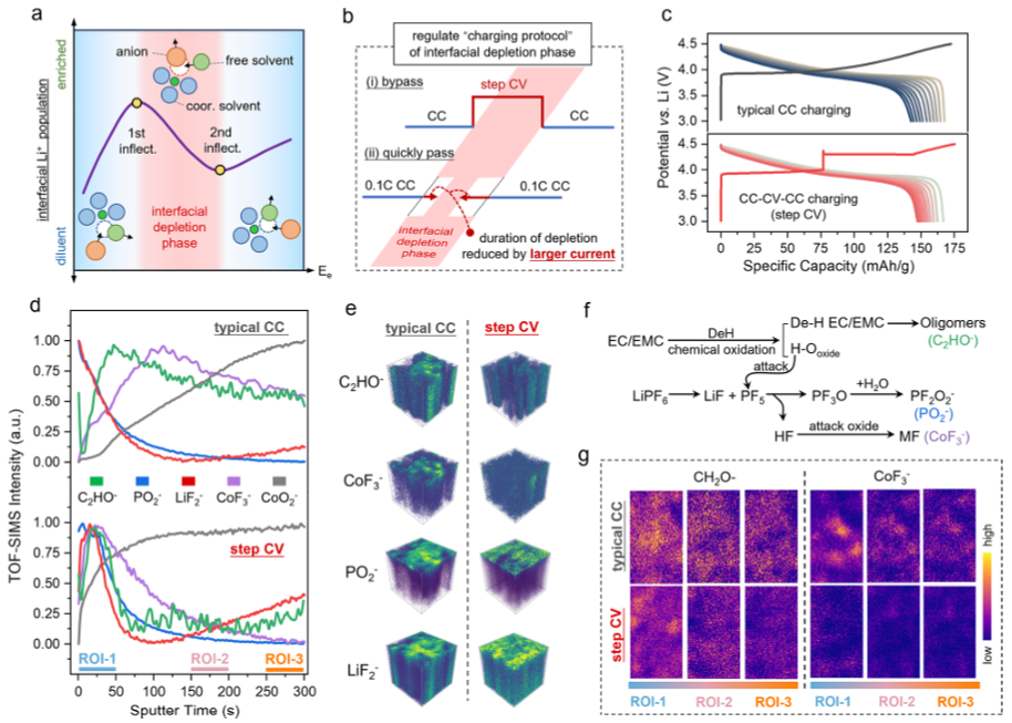 图5.充电方案调节调控CEI形成。(a)界面Li+布居三阶段演变示意图及相应的界面溶剂化构型。(b)基于降低界面耗尽区贡献的活化方案优化设计原理。(c)Li||LCO半电池在典型CC和阶梯CV活化后充电曲线及循环性能对比。分别对典型CC和阶梯CV活化3个循环后的CEI进行TOF-SIMS分析。(d)代表性无机和有机碎片的归一化深度剖面图;(e)不同活化方案后从正极提取的选定CEI碎片的相应3D渲染图。(f)LCO正极上电解液分解的氧化途径。(g)不同深度段中CH2O–和CoF3–碎片的TOF-SIMS化学映射图像。