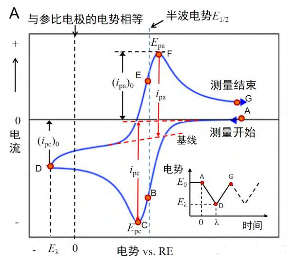 CV的测量原理是使电势在工作电极上作三角波扫描的同时,电势以给定的速率υ从起始电势E0扫描到终止电势Eλ后,再以相同速率反向扫描至E0,并记录相应的电流–电势(i–E)曲线,也称伏安曲线(图1),λ为电势换向时间。