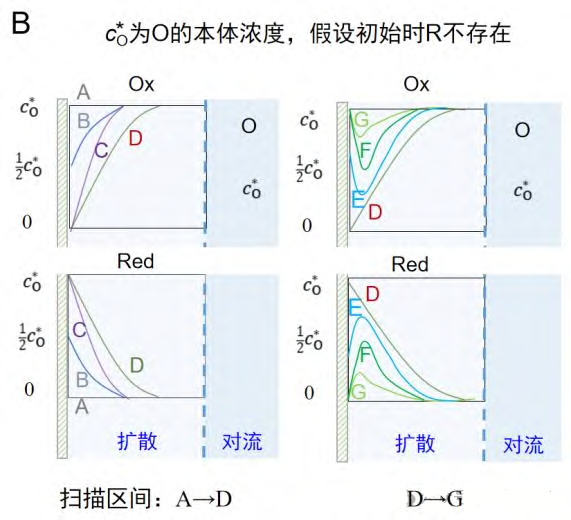 当电势由正向负扫描(A →D)时,随着电势的负移,电极表面处Ox被还原为Red,Ox浓度逐渐降低(图1B左上),Red的浓度逐渐增加(图1B左下)。当电势扫描至C点时,电流出现极大值,此时电极表面处Ox的还原速率达到最大,即发生完全浓差极化CsOx= 0,Ox的扩散速率赶不上Ox的还原速率;当电势继续由C扫描至D点,CsOx= 0依旧维持为0,此时扩散层厚度向纵深处发展(扩散层厚度增加),致使Ox的扩散速率变缓,故而阴极电流下降。当到达D点后,电势开始回扫,随着外加电势的正移,电极表面还原生成的Red重新被氧化为Ox,使CsOx增加,Csred减少。。图1A中B点和E点对应CsOx =Csred= 1/2C*Ox ,根据Nernst方程,此时电极电势E对应于CV图中两个峰(C和F)的半波电势E1/2,这也可直接用于估算可逆电子转移反应的形式电势EӨ’。
