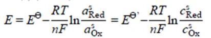 其中E、EӨ、EӨ’分别为氧化还原电对的电极电势、标准电极电势和形式电势,R为气体常数,T为热力学温度,n为参加电极反应的电子转移数,F为Faraday常数,as和cs为物质在电极表面处的活度和浓度。