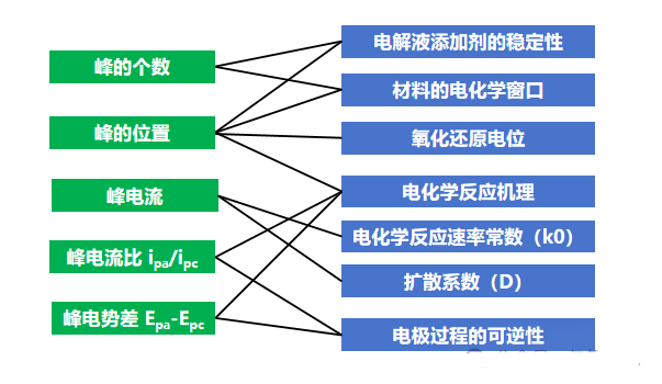 CV测试在电池中可以进行材料与电解液的评估,Li离子扩散系数的测定,电化学行为评估,电极吸附行为和扩散行为区分。(我们可以通过峰的个数,峰的位置,峰电流,峰电流Ipa/Ipc,峰电势差Epa-Epc来判断)如下图所示: