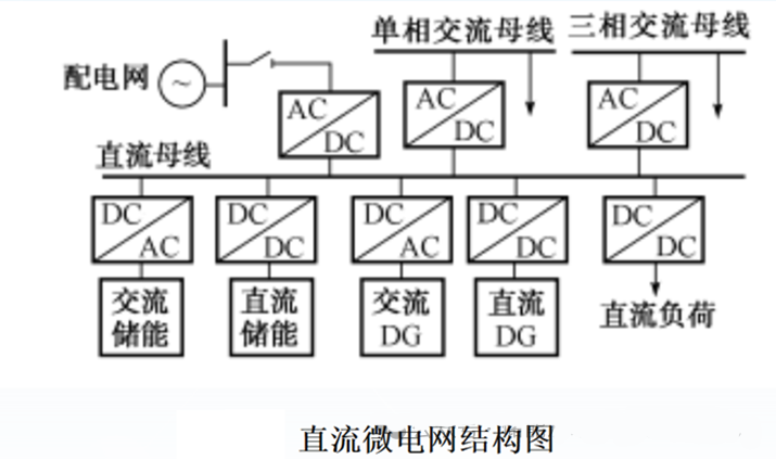 直流微电网的结构如上图,其特征是系统中的DG、储能装置、负荷等均通过电力电子变换装置连接至直流母线,直流网络再通过逆变装置连接至外部交流电网。直流网络再通过逆变装置连接至外部交流电网。直流微电网通过电力电子变换装置可以向不同电压等级的交流、直流负荷提供电能,DG和负荷的波动可由储能装置在直流侧补偿。
