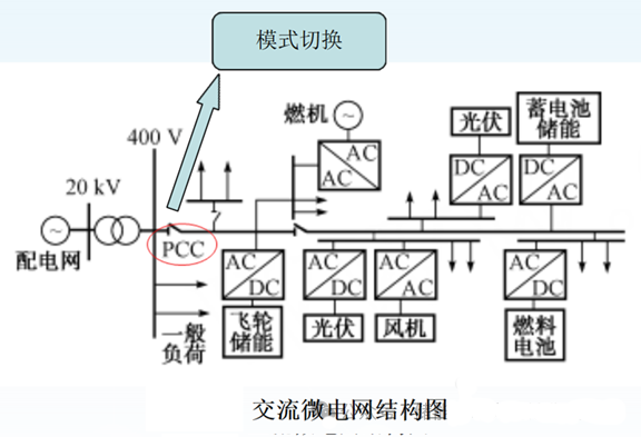 是指采用交流母线构成的微电网,交流母线通过公共连接点(PCC)断路器控制,实现微电网并网运行和离网运行。