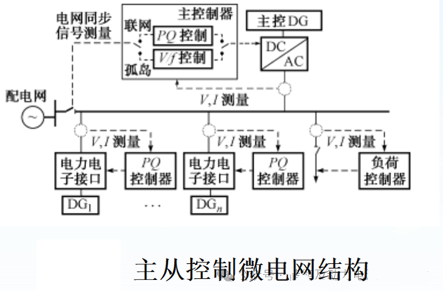 其核心理念为V/f控制和PQ控制的有机结合,在微电网处于孤岛运行模式时,其中一个DG或储能装置作为主电源,采取定电压定频率控制(V/f控制),用于向微电网中的其它DG提供电压和频率参考,而其它DG则可采用定功率控制(PQ控制),如下图,采用V/f模式的DG控制器称主控制器,而其它DG的控制器为从控制器,各从控制器将根据主控制器来决定自己的运行方式。