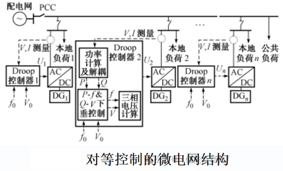该控制方法的核心思想是功率的共享,是指微电网中所有DG在控制上都具有同等的地位,各控制器间不存在主从关系,每个DG都根据接入系统点电压和频率的就地信息进行控制。控制原理是依据微电网电源的下垂特性和与负荷之间的关系,通过采用P-f和Q-V下垂控制方法,对每一个分布式电源进行控制,将系统负荷变化引起的不平衡功率分摊给所有电源,以此来完成对系统功率的调节,保证其稳定性。