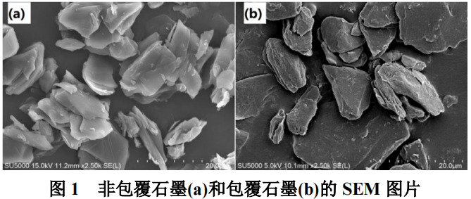 图1是非包覆石墨和包覆石墨的SEM图片。非包覆石墨和包覆石墨都是由粒径较小的二次颗粒组成的,非包覆石墨相对更明显,这种结构有利于降低石墨O/I值,改善电极循环过程中的体积膨胀。非包覆石墨颗粒棱角比较分明,包覆石墨颗粒表面则较为圆滑,说明包覆无定形碳可以改变石墨颗粒表面形貌,减少颗粒表面的缺陷。