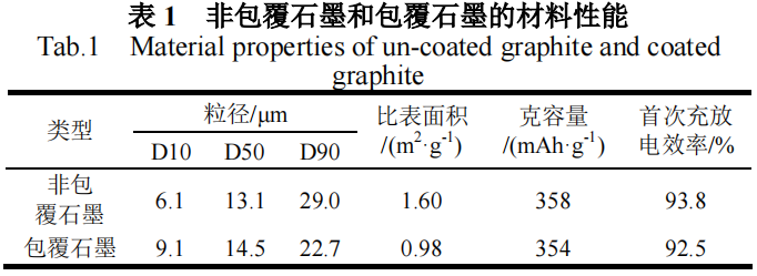 纽扣电池制备:将采用非包覆石墨或包覆石墨作为活性物质的负极浆料涂布到铜箔上,经辊压和冲切得到两组纽扣电池负极片。在手套箱中组装纽扣电池,以锂片做参比电极和对电极,搭配商用电解液和PE隔膜。